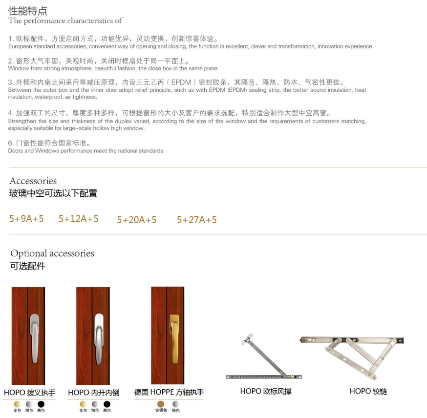 【产品系列】:塞纳 【产品性能】:水密性能5级、隔音性能≥35DB、气密性能6级、抗风压性能8级、保温性能K≤2.5 【产品结构】:采用6063-T5铝材,防水轨隐藏排水结构,四道防撞胶条密封设计,5+20A+5中空玻璃 【五金配件】:标配好博窄边暗锁