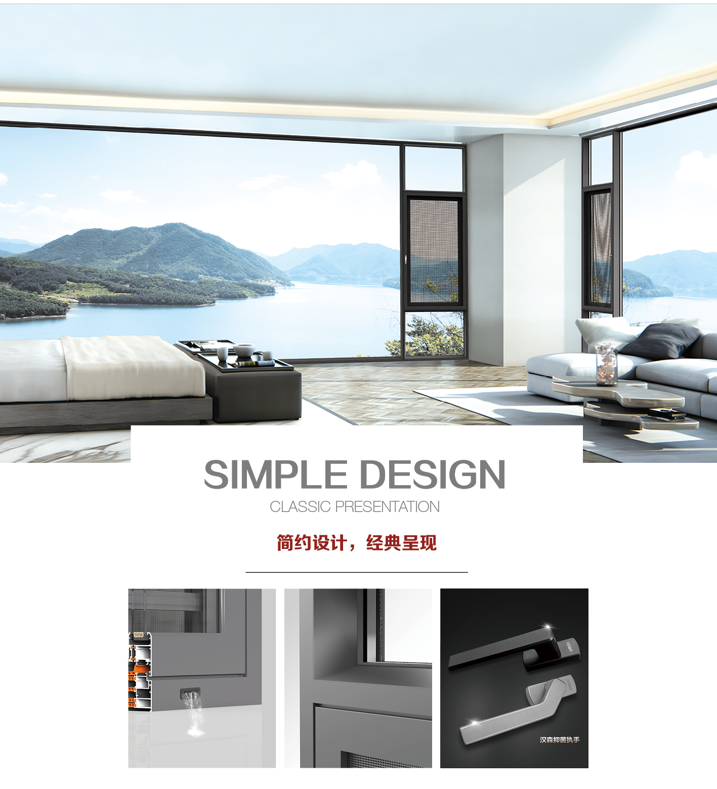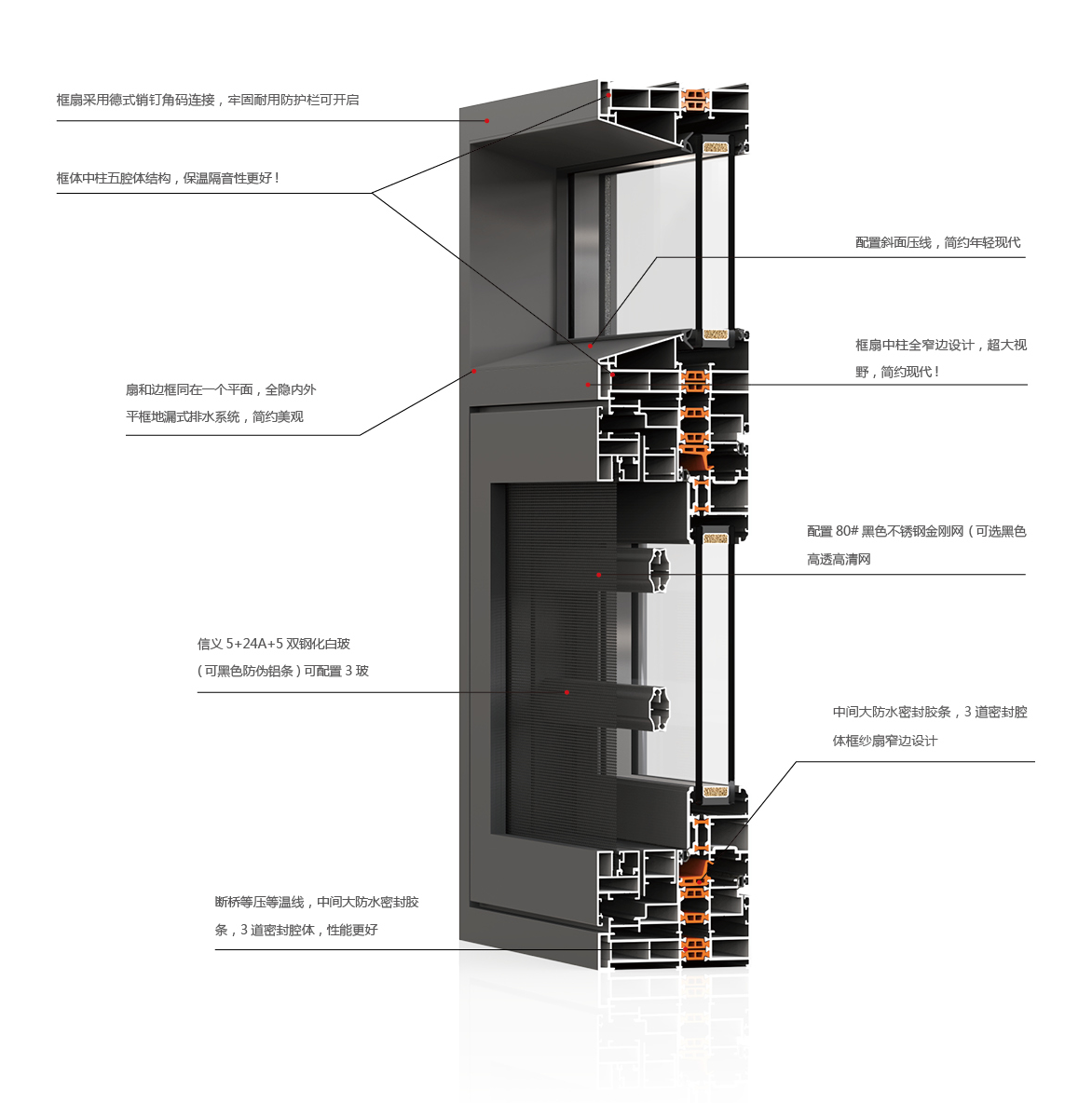 【产品系列】:塞纳 【产品性能】:水密性能5级、隔音性能≥35DB、气密性能6级、抗风压性能8级、保温性能K≤2.5 【产品结构】:采用6063-T5铝材,防水轨隐藏排水结构,四道防撞胶条密封设计,5+20A+5中空玻璃 【五金配件】:标配好博窄边暗锁