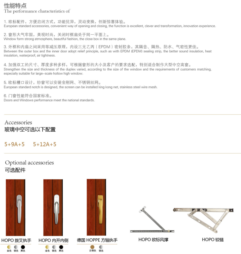 【产品系列】:塞纳 【产品性能】:水密性能5级、隔音性能≥35DB、气密性能6级、抗风压性能8级、保温性能K≤2.5 【产品结构】:采用6063-T5铝材,防水轨隐藏排水结构,四道防撞胶条密封设计,5+20A+5中空玻璃 【五金配件】:标配好博窄边暗锁