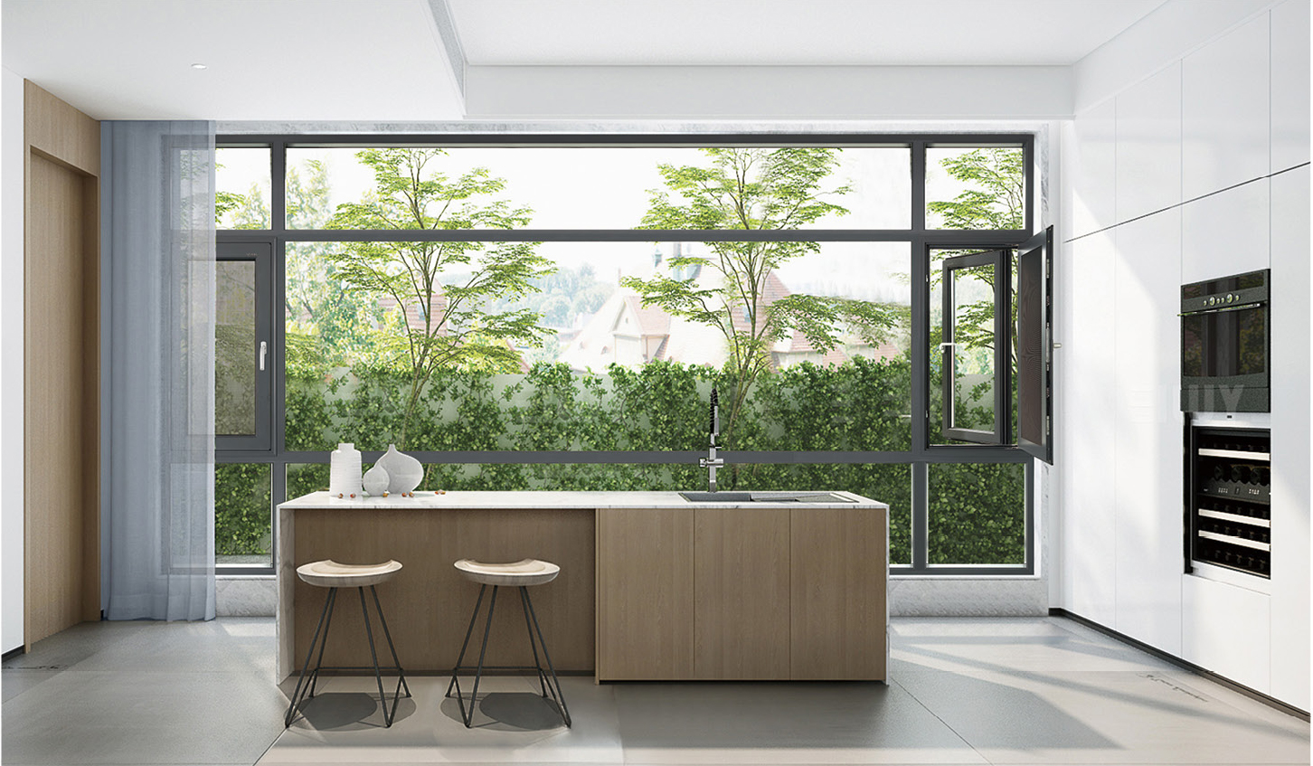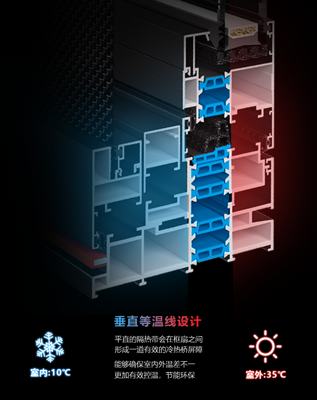 HSMC汉森门窗采用多腔体断桥铝结构,特殊的多道密封防水设计,使得水、气分为两个独立的腔室,这样也就在一定程度上提高了门窗的水、气密性能,极大限度地减少空气对流造成的室内外热量传导。同时,在隔热条的选用上也有严格要求。在维持最佳性能的同时,通过垂直等温线设计阻止门窗直接的热传导、最大程度上降低热导系数、优化隔热效率、降低能量消耗、保持舒适的室内温度。