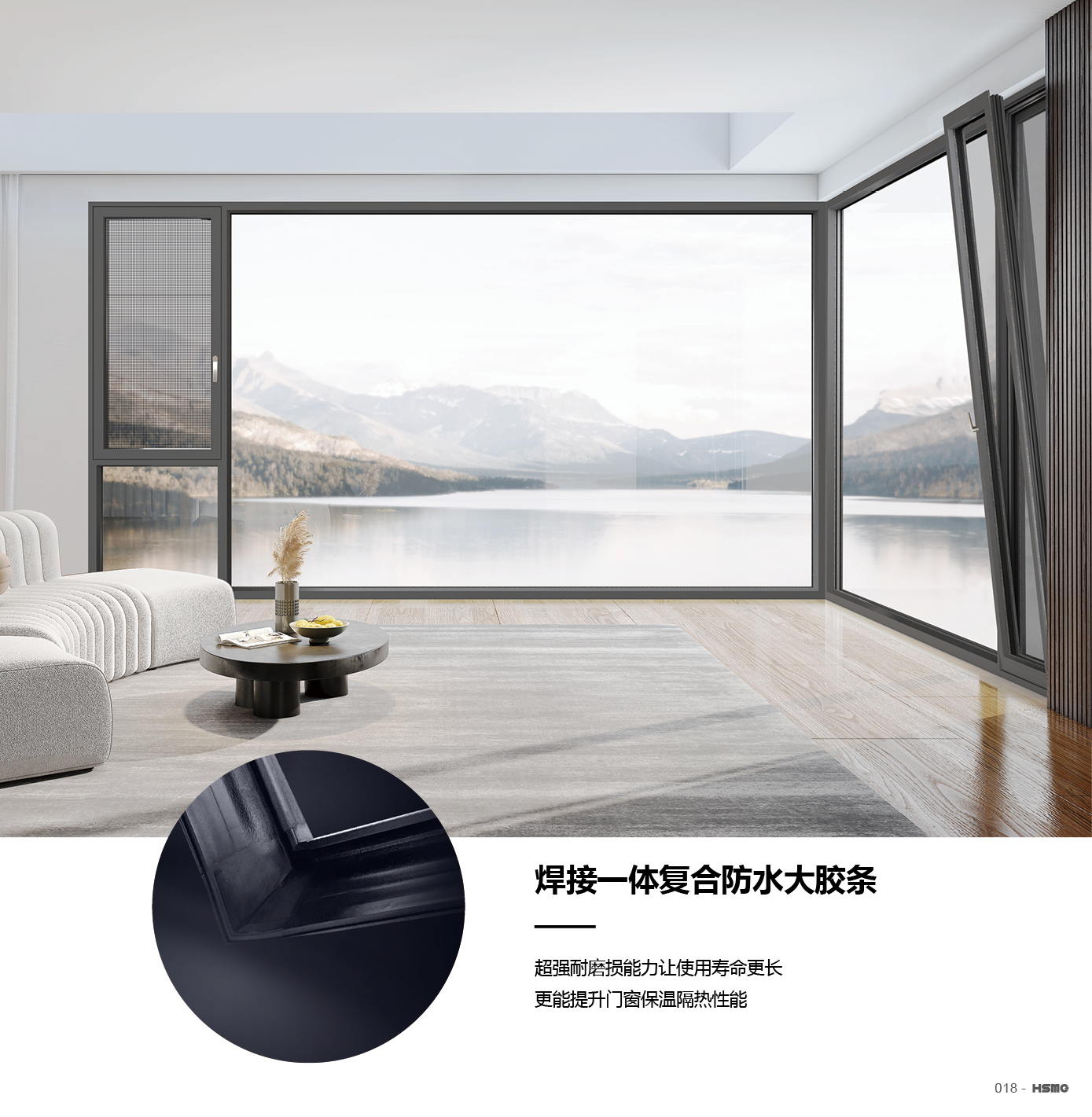【产品系列】:塞纳 【产品性能】:水密性能5级、隔音性能≥35DB、气密性能6级、抗风压性能8级、保温性能K≤2.5 【产品结构】:采用6063-T5铝材,防水轨隐藏排水结构,四道防撞胶条密封设计,5+20A+5中空玻璃 【五金配件】:标配好博窄边暗锁